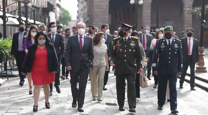 Desde el balcón central de Palacio de Gobierno presenció el desfile conmemorativo en el que participó personal de la SSPE,