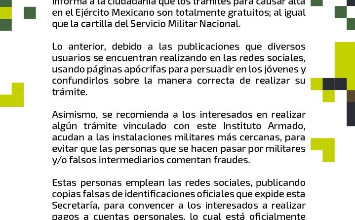Read MoreDebido a diferentes publicaciones en redes sociales donde se utilizan páginas apócrifas para persuadir a jóvenes de unirse al Ejército