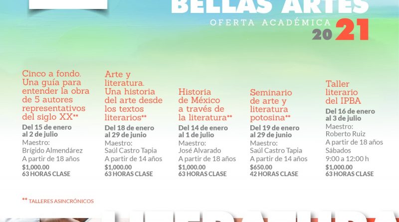 El Instituto Potosino de Bellas Artes (IPBA) está por iniciar un nuevo semestre este 18 de enero de 2021 con una cartelera de aproximadamente 35 programas digitales en todas sus áreas, destacando en esta ocasión el área de Literatura, con una oferta educativa variada para las y los interesados, informó el titular de la Secretaria de Cultura (SECULT), Armando Herrera Silva.