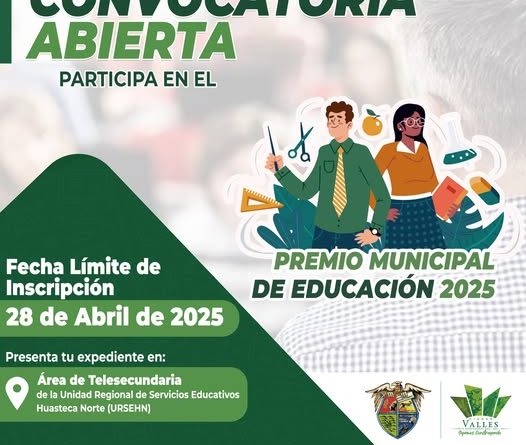El H. Ayuntamiento de Ciudad Valles, a través de la Dirección de Educación Municipal, en coordinación con la Unidad Regional de Servicios Educativos de la Huasteca Norte (URSEHN) y la Coordinación Municipal de la Sección 26 del Sindicato Nacional de Trabajadores de la Educación (SNTE), convocan a participar en el Premio Municipal de Educación 2025, dirigido al personal docente que labora en los niveles medio superior y superior en este municipio.