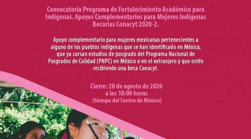 En el marco del Programa de Fortalecimiento Académico para Indígenas que coordina el Consejo Nacional de Ciencia y Tecnología, se extiende la invitación para participar en la convocatoria del Programa de Fortalecimiento Académico para Indígenas, Apoyos Complementarios para Becarias del CONACYT 2020-2.