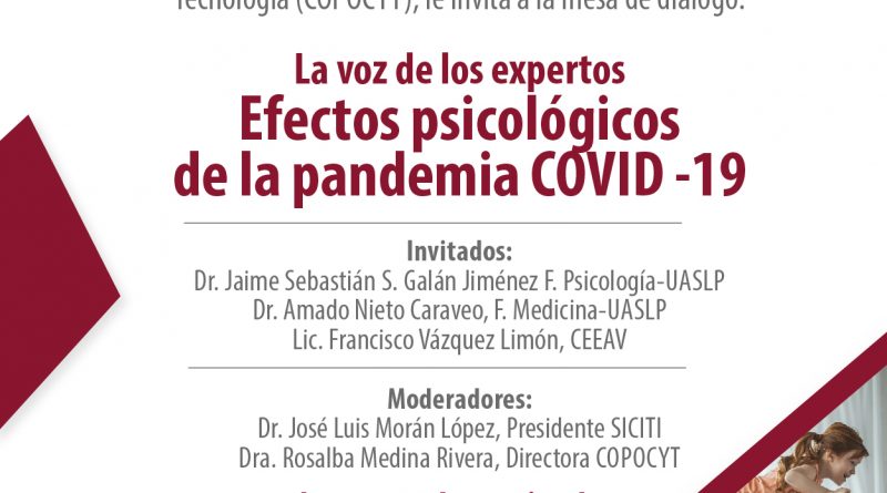 Como parte de la estrategia frente al COVID-19, el Consejo Potosino de Ciencia y Tecnología (COPOCYT) y el Sistema de Ciencia, Tecnología e Innovación del Estado de San Luis Potosí (SICITI), invitan a la mesa de diálogo “La voz de los expertos: Efectos psicológicos de la pandemia COVID-19”, que se llevará a cabo el jueves 24 de septiembre a las 17:00 horas a través de redes sociales, informó Rosalba Medina Rivera, directora general de la dependencia.
