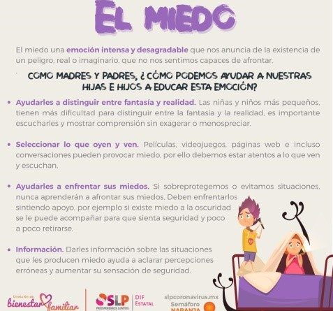 Se recomienda ayudarles a distinguir entre la fantasía y la realidad, pues es muy común que las niñas y niños más pequeños sobre todo, tengan dificultad para distinguir entre ambos panoramas, por lo que es importante escucharles con atención y mostrar comprensión sin exagerar y menospreciar; en caso de que su miedo esté relacionado al Covid-19 y lo que ocurre en el estado, en el país o en el mundo, se les debe explicar claramente qué es lo que ocurre y qué se está haciendo para evitar un escenario negativo.