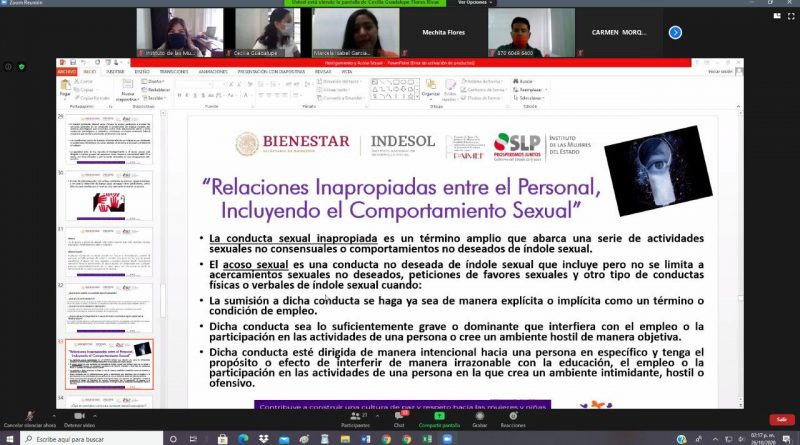 Personal del Centro Penitenciario de Ciudad Valles participó en el taller virtual: “Conciencia sobre acoso, abuso y conducta sexual inadecuada” y “Relaciones inapropiadas entre el personal administrativo, incluyendo el comportamiento sexual”, informó Erika Velázquez Gutiérrez, directora general del Instituto de las Mujeres del Estado (IMES).