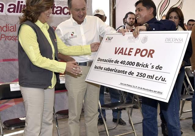 - Recibe mandatario donación de 40 mil bricks de leche saborizada de DICONSA para ser incluidas en los desayunos escolares.