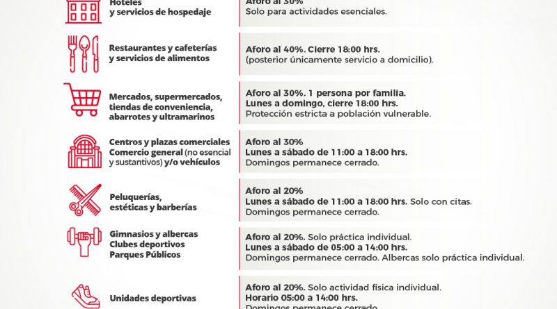 Los hoteles y servicios de hospedaje reducirán su aforo al 30 por ciento y solo para actividades esenciales; mercados, supermercados, tiendas de conveniencia, abarrotes y ultramarinos también tendrán una disminución en el aforo permitido al 30 por ciento además de permitir el acceso solo a una persona por familia, protección estricta para la población vulnerable, y el cierre de sus instalaciones de lunes a domingo a las 18:00 horas; restaurantes, cafeterías y servicios de alimentos, tendrán un aforo del 40% y su cierre al público a las 18:00, posteriormente solo podrán vender para servicios a domicilio.