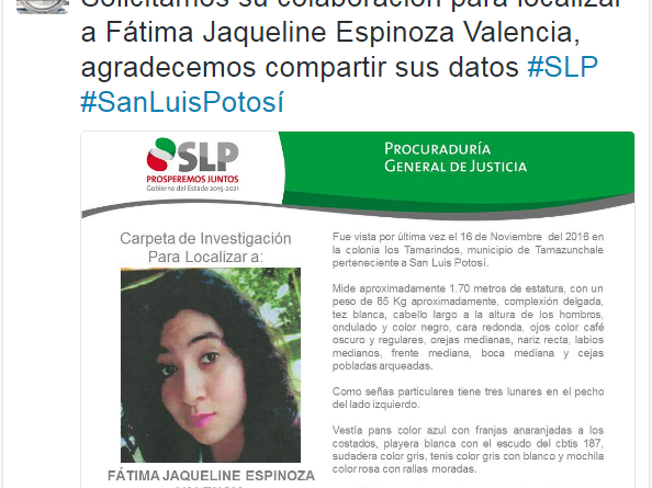 Solicitamos su colaboración para localizar a Fátima Jaqueline Espinoza Valencia, agradecemos compartir sus datos #SLP #SanLuisPotosí