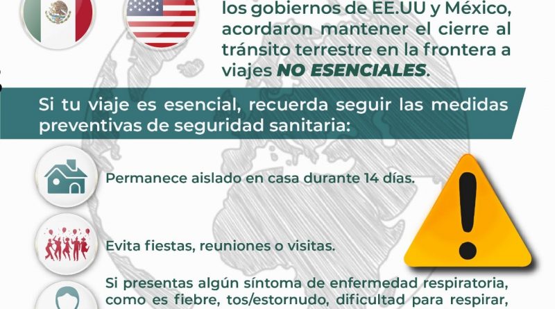 La Secretaría de Relaciones Exteriores (SRE), informó que las medidas preventivas puestas en vigor en marzo de 2020 por el Covid-19 se mantendrán vigentes hasta las 23:59 horas del 21 de enero del 2021, por lo que el cierre parcial al tránsito terrestre en las fronteras comunes con la Unión americana continúa a los viajes no esenciales.