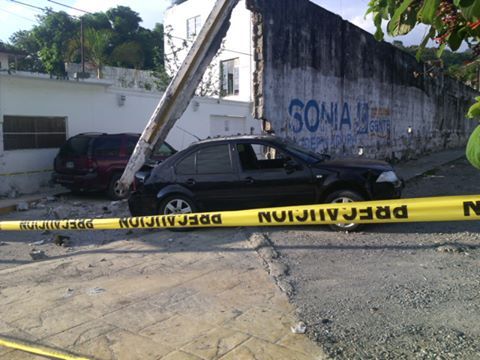 Tamazunchale.- Esta mañana de Jueves un conductor perdería el control de su vehículo tipo Jetta negro en un estacionamiento del centro de Tamazunchale, se presume una falla mecánica al accionar la reversa del vehículo, las autoridades cercaron el lugar con cinta de precaución por el riesgo de que se desplome una de las estructuras de cemento.