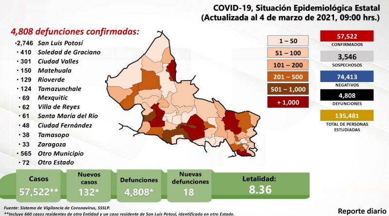 De las 21 defunciones de este día, 11 corresponden a hombres y 10 mujeres; 15 de ellos eran de la capital, 2 de Soledad, 1 de Matehuala, Moctezuma, Cerro de San Pedro, Ciudad Fernández, Rioverde y Axtla de Terrazas, que presentaban morbilidades de hipertensión arterial, edad, diabetes y obesidad. Durante el informe técnico se detalló que en zona COVID-19, se tiene una ocupación de 20 por ciento en camas en pacientes sin ventilador y de 26 por ciento con ventilador; asimismo, de los casos nuevos, 71 corresponden a mujeres y 61 a hombres de entre 0 y 76 años de edad y 17 son los municipios con incremento de casos.