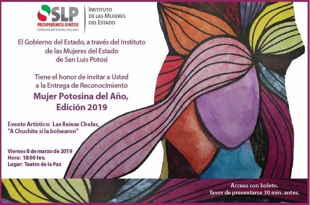 En el marco de la conmemoración del Día Internacional de la Mujer, el Gobierno del Estado de San Luis Potosí, a través del Instituto de las Mujeres del Estado (IMES), invita el próximo viernes 8 de marzo a la entrega del reconocimiento: “Mujer Potosina del Año” edición 2019, informó Erika Velázquez Gutiérrez, Directora General del Instituto.
