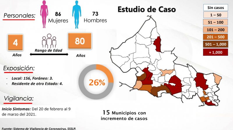 Durante la rueda de prensa virtual del Comité Estatal para la Seguridad en Salud (CESS), en las últimas 24 horas se reportan 159 nuevos contagios de coronavirus y 16 defunciones, para alcanzar un total de 58 mil 456 casos y 4 mil 935 fallecimientos, desde el inicio de la pandemia en San Luis Potosí; se tiene una ocupación del 17 por ciento en áreas de pacientes que no requieren ventilador y de 25 por ciento con ventilador.