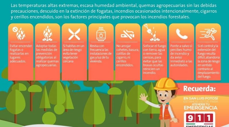La dependencia indicó que, de acuerdo al pronóstico del Servicio Meteorológico Nacional, se registrarán temperaturas superiores a los 40 grados en promedio en la zona Huasteca y Media, y hasta los 34 grados en la capital del estado, por lo que pidió guardar todas las medidas preventivas para evitar la generación de incendios forestales, como no arrojar cerillos o cigarrillos a la carretera, evitar hacer fogatas, o si se realizan cerciorarse de que se apaguen por completo.